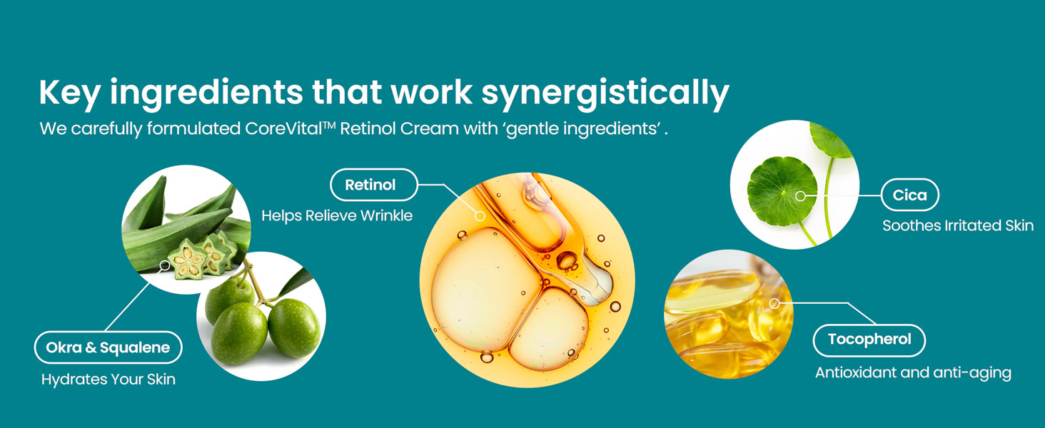 While smoothening, hydrating, and nourishing your skin, we ensure a noninvasive approach. With sensitive skin in mind, we carefully formulated CoreVital Retinol Cream with 'gentle ingredients':
